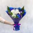 Букет голубых хризантем и розовых роз