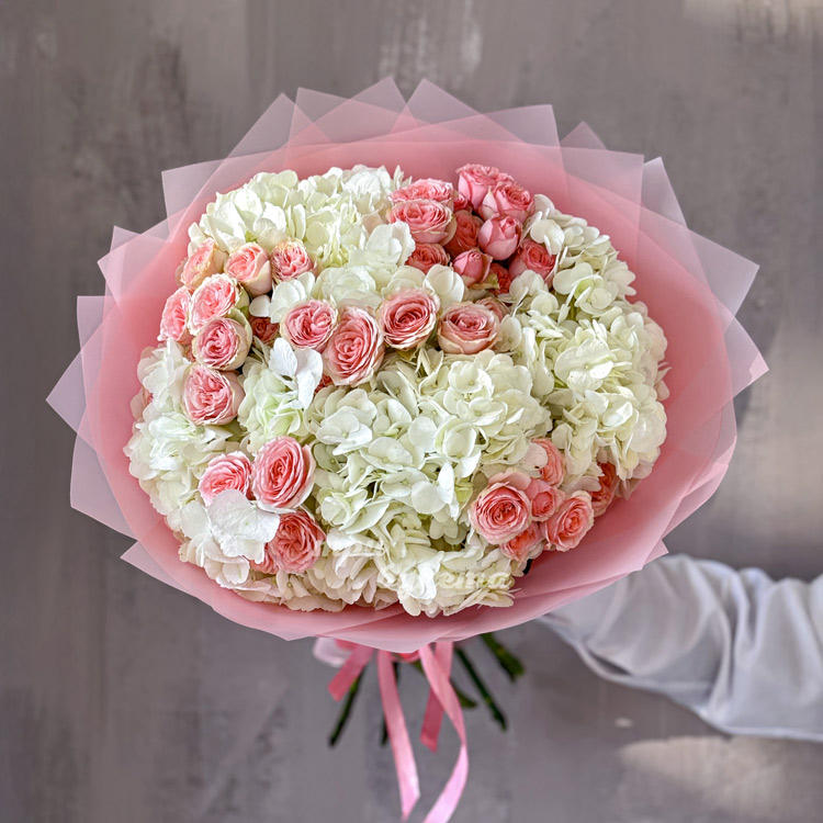Букет белых гортензий и розовых кустовых роз