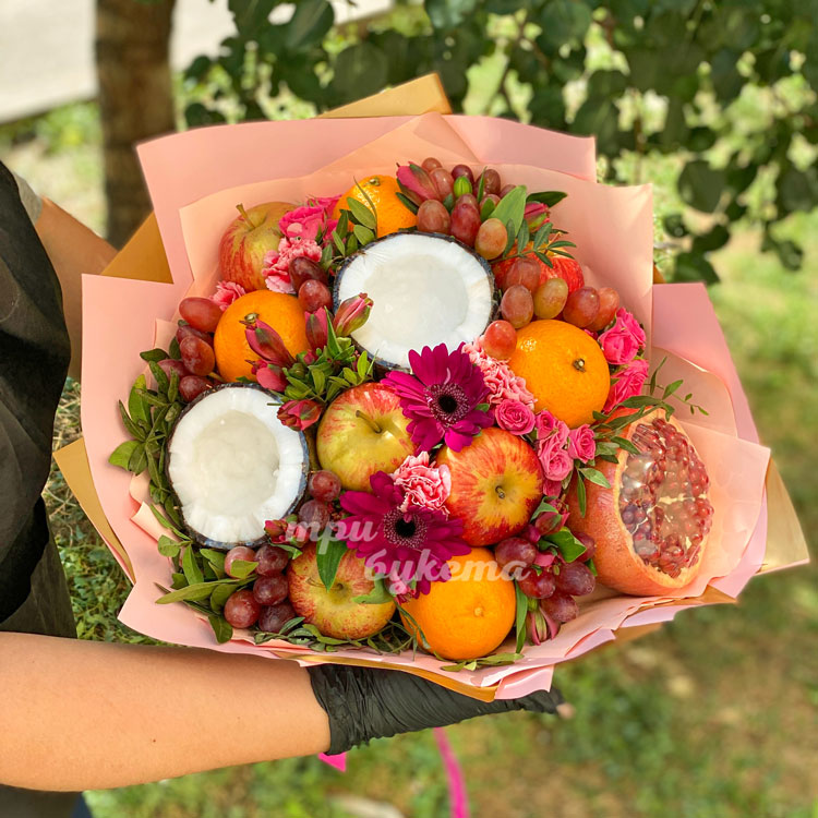 Букет из апельсинов, яблок и цветов