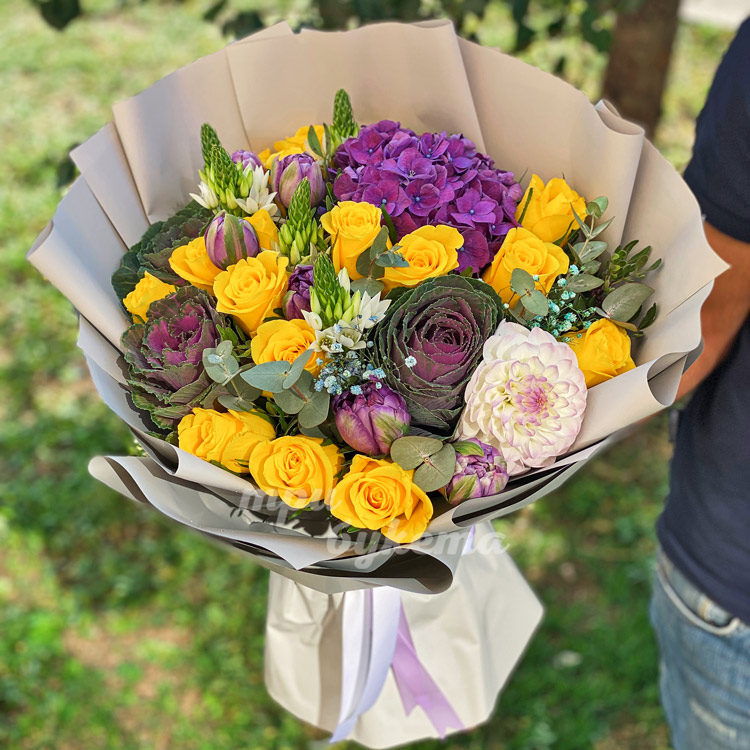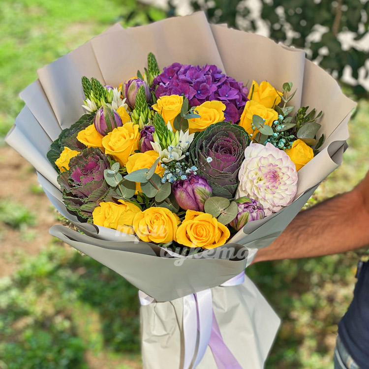 Цветы брассики с желтыми розами