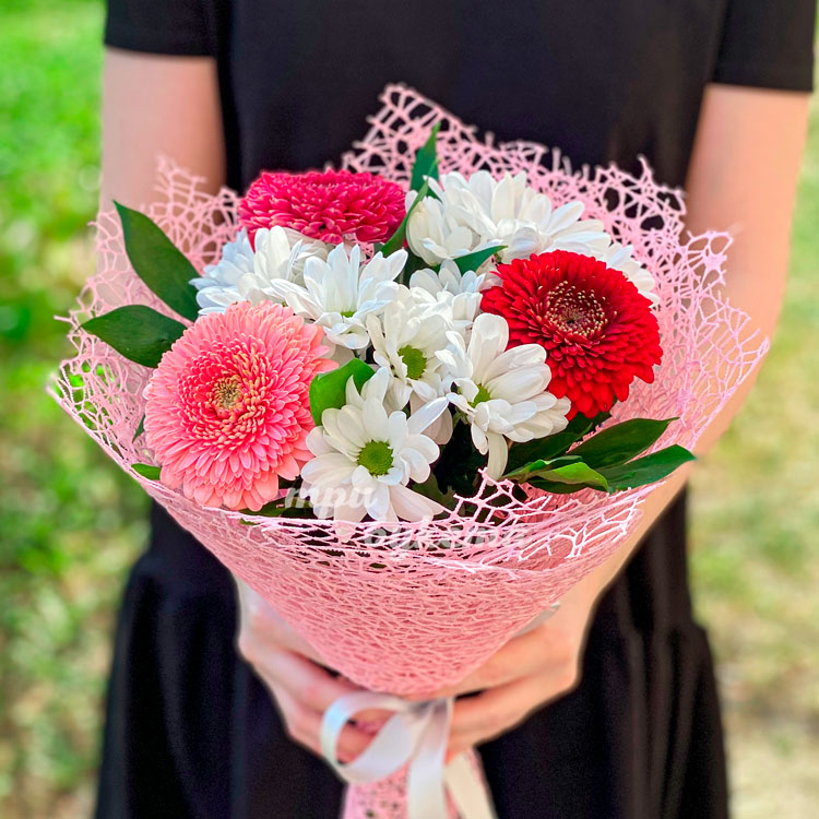 Герберы и хризантемы в розовом сизале