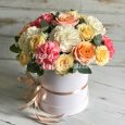 Композиция из роз, гвоздик и хлопка