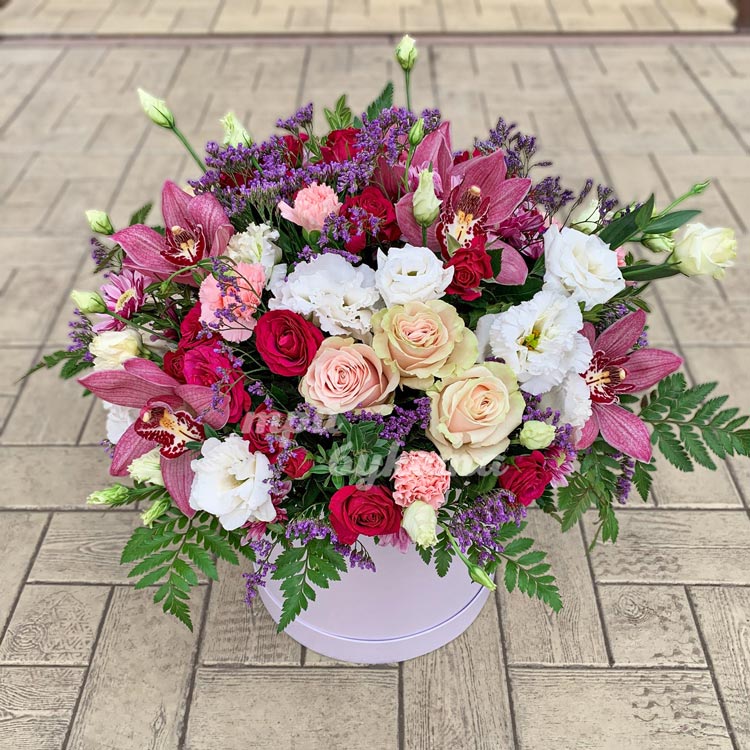 Коробка бордовых орхидей, роз и эустом