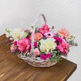 Корзина коралловых роз и розовых пионов