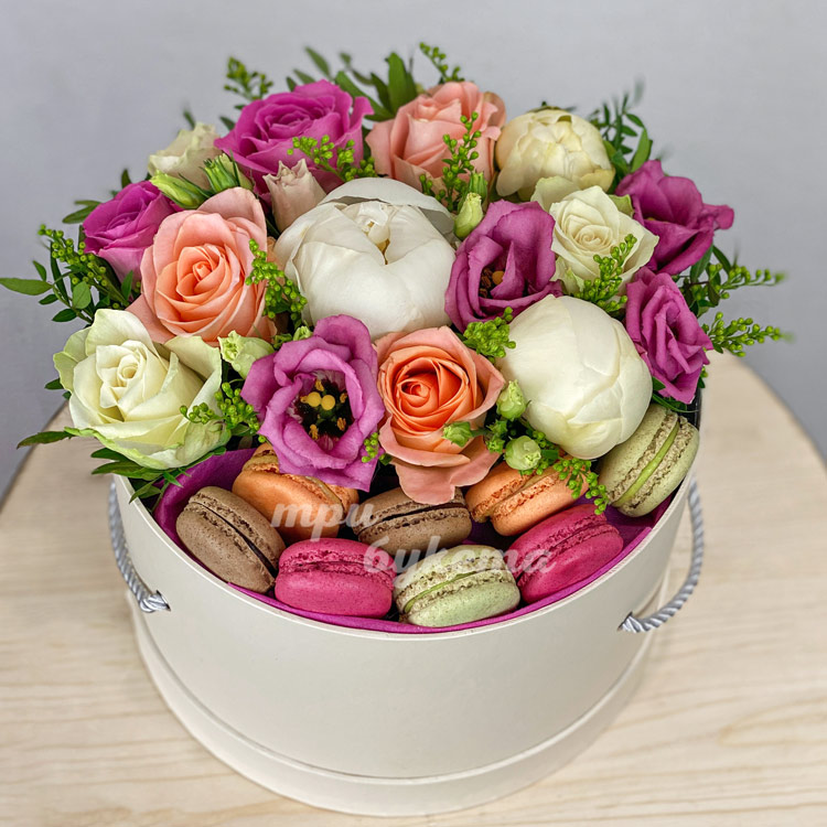 Пионы и розы с макарунами в коробке