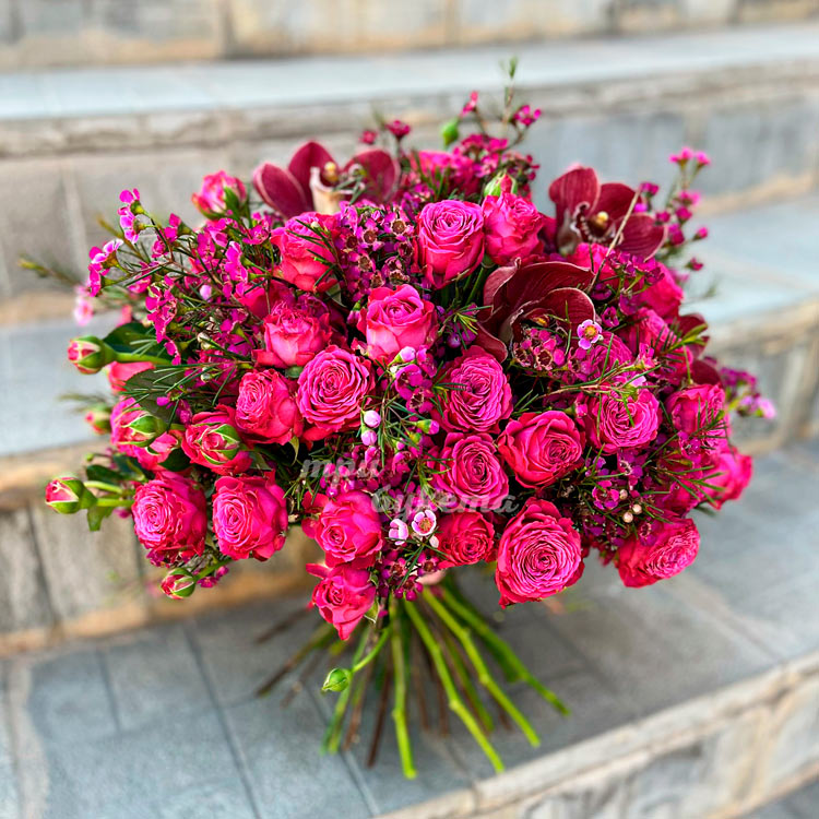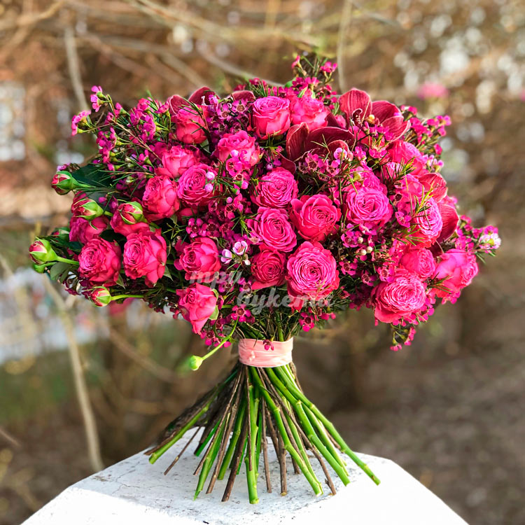 Розовый букет роз с хамелациумом