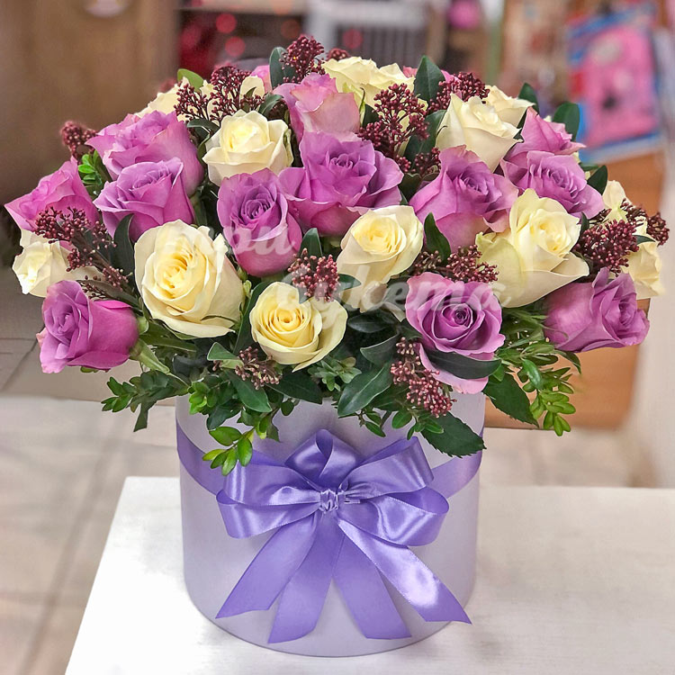 Розы и скимия в шляпной коробке
