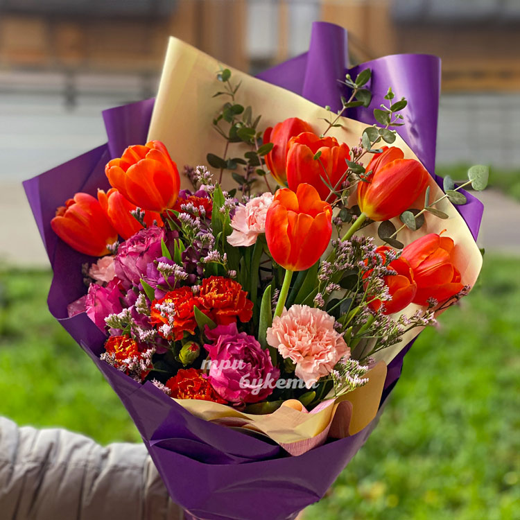 Яркий букет оранжевых тюльпанов и гвоздик